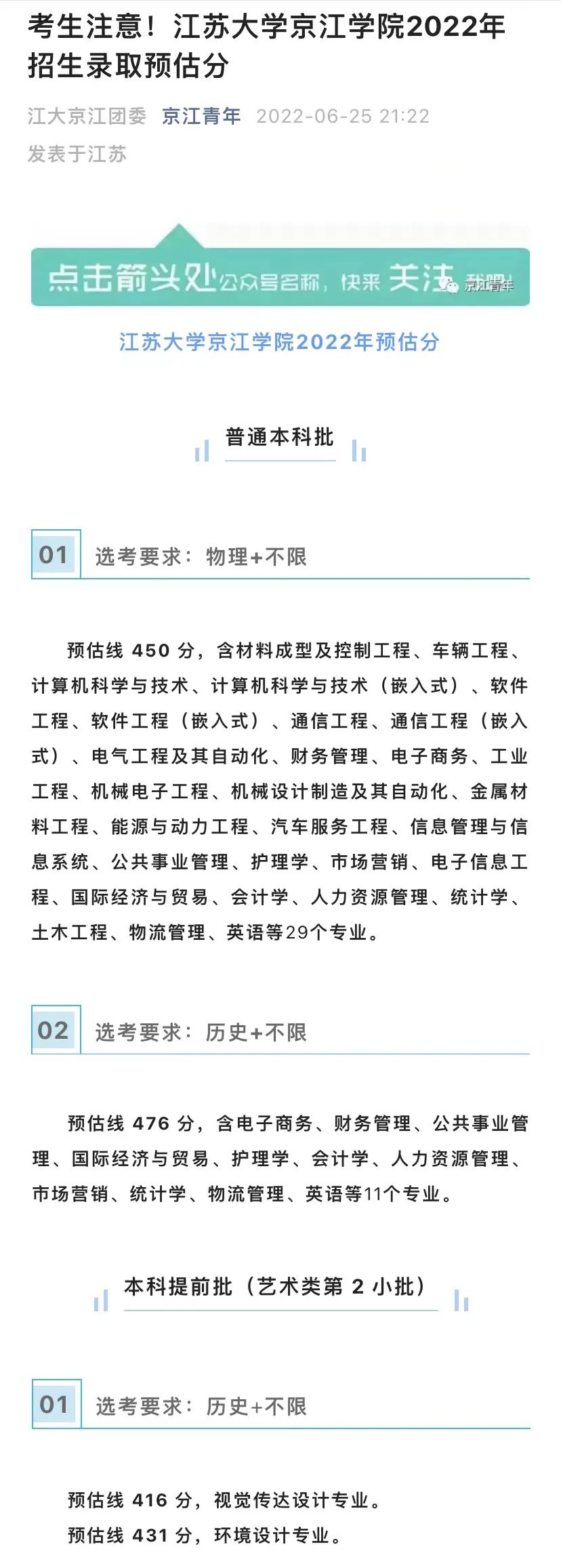 该篇文章获得阅读量排行TOP1。江苏大学京江学院发布2022年招生录取预估分,为考生填报志愿提供参考,并就志愿填报相关的细节作了具体说明。