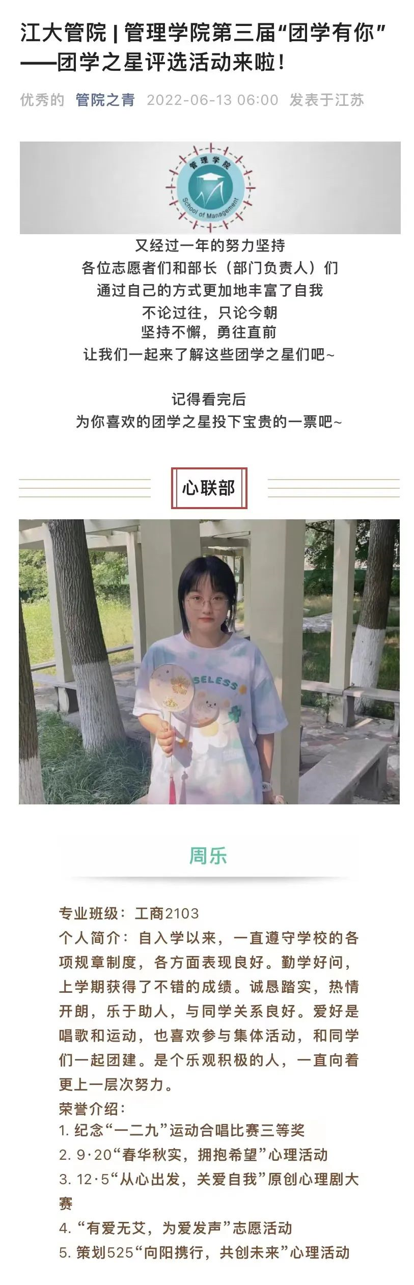 该篇文章获得阅读量排行TOP2。管理学院开展“团学之星”评选活动,对评选出的“团学之星”候选人进行展示。推文整体版式清爽,内容积极向上。