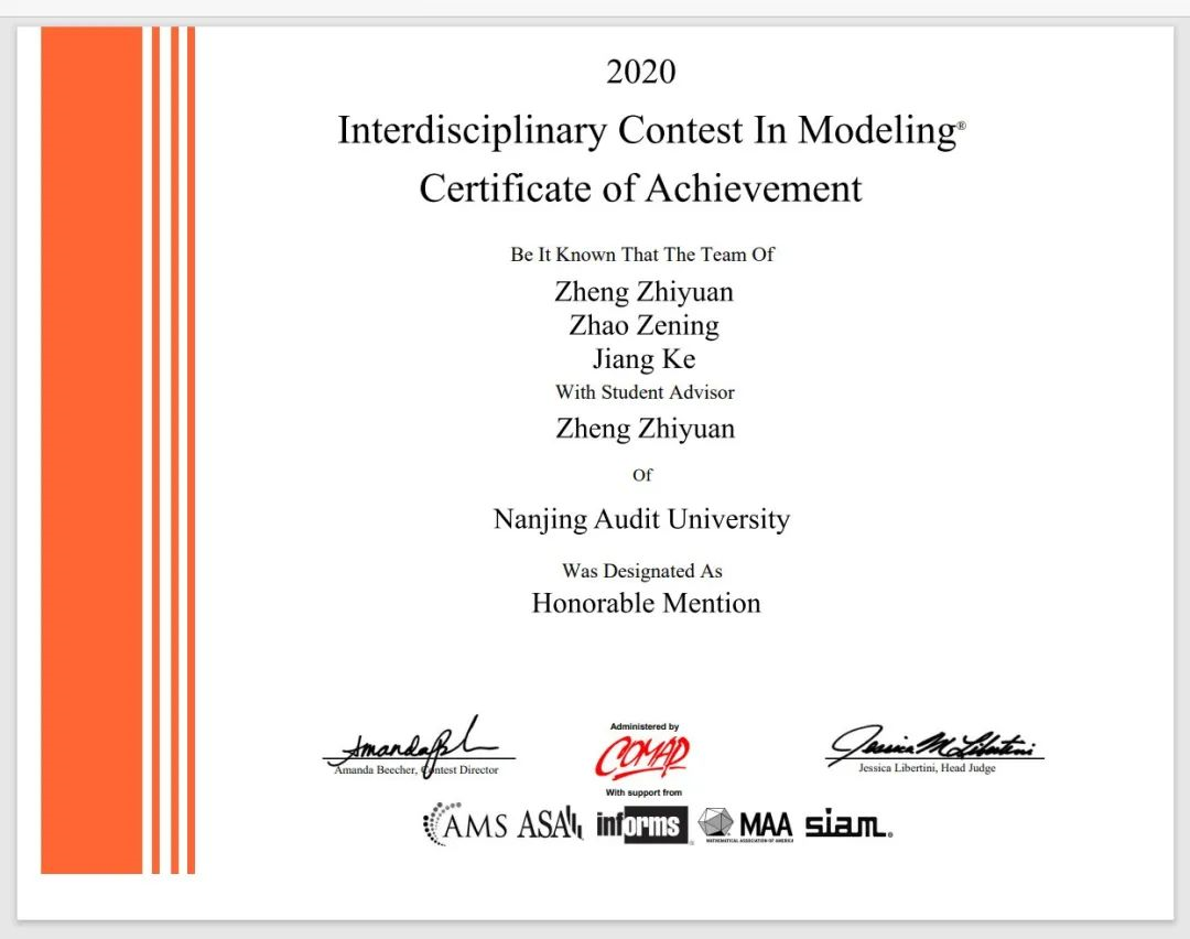 大学期间的郑志远在学科竞赛方面也很活跃,且均取得了不错的成绩。江苏省挑战杯创业计划竞赛银奖、全国大学生数学竞赛(非数学类)三等奖、挑战杯创业计划竞赛校内赛金、铜奖、互联网+创新创业大赛校一等奖,南审杯数学建模大赛二等奖等等。但让他记忆最深的是获得H奖(国际二等奖)的美国大学生数学建模竞赛和获国家优胜奖的全国大学生信息安全竞赛(软工组)。