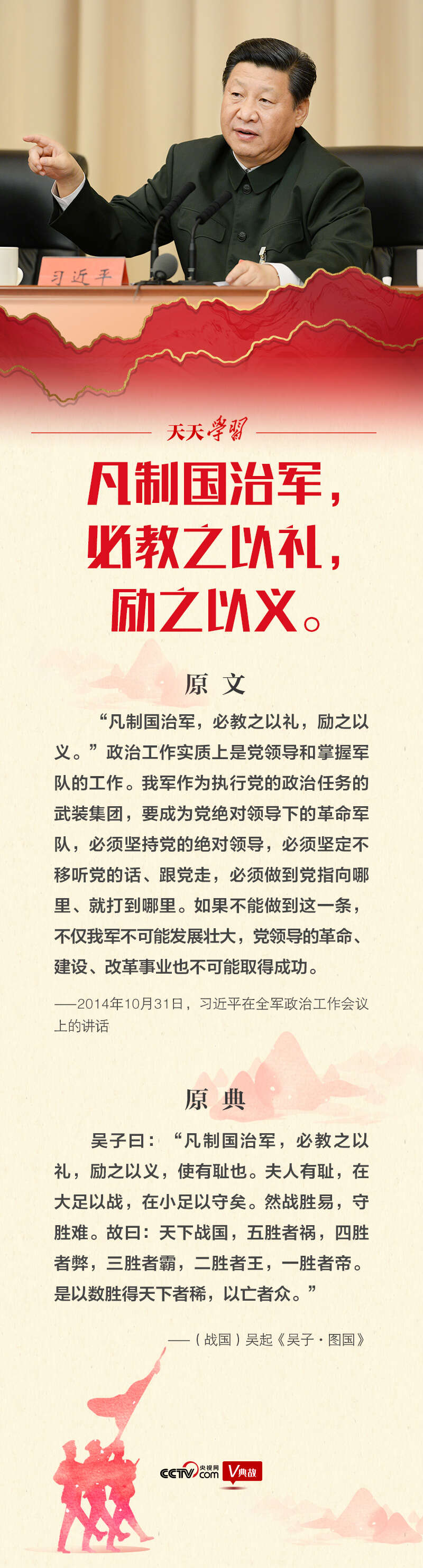 吴起对军事理论的论述,是围绕着治国的根本目的展开的。在《吴子·图国》中,吴起指出,要使国家强盛,就要“内修文德,外治武备”。其所谓的“文德”,就是“道、义、礼、仁”。他说:“凡制国治军,必教之以礼,励之以义,使有耻也。”意思是治理国家和军队,必须用“礼”来教育人们,用“义”来勉励人们,使他们有耻辱心。吴起认为,军队有了耻辱心,就可以“进死为荣,退生为辱”,从大处讲能够使军队为追求荣誉而战,从小处讲也能够让军队誓死坚守阵地。