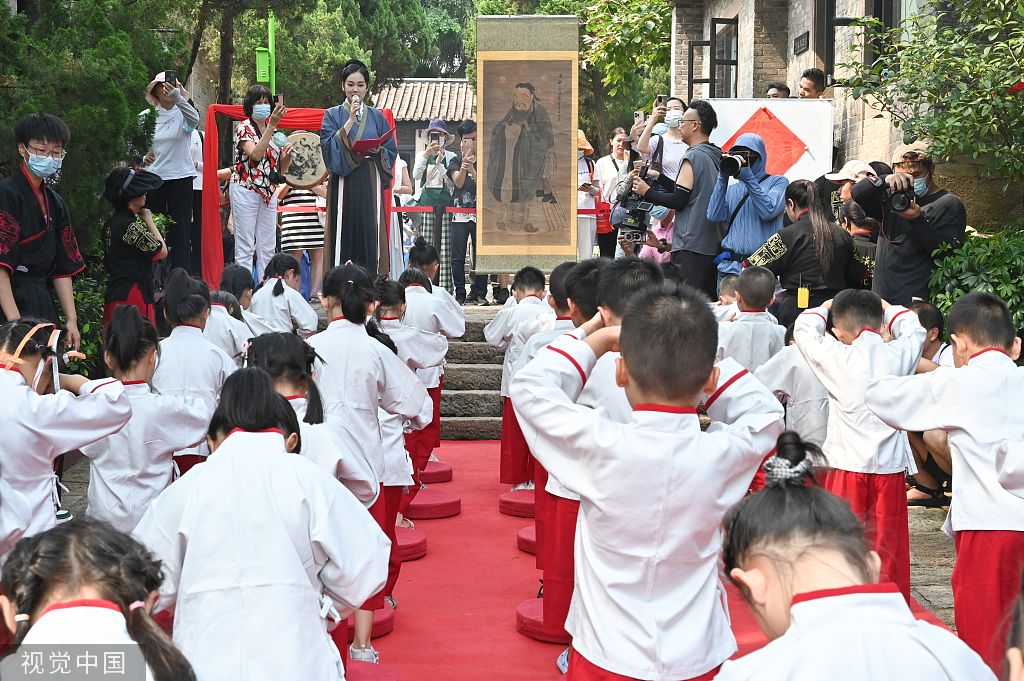 2022年7月31日,广东广州,学童瞻仰孔子画像并鞠躬行礼,致敬先贤。当日,一场传统“开笔礼”在广州番禺莲花山莲花古城内举行。小学童身穿传统服装,通过正衣冠、朱砂启智、写“人”字、击鼓鸣志等仪式接受传统文化教育。 中新社记者 陈楚红 摄