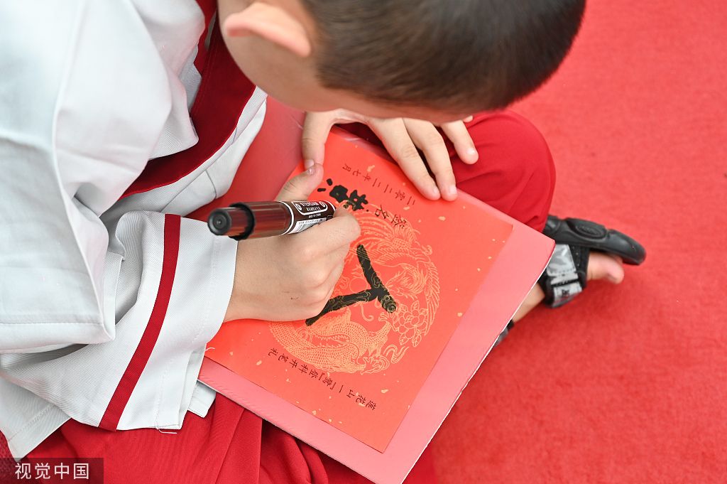2022年7月31日,广东广州,小学童书写“人”字。当日,一场传统“开笔礼”在广州番禺莲花山莲花古城内举行。小学童身穿传统服装,通过正衣冠、朱砂启智、写“人”字、击鼓鸣志等仪式接受传统文化教育。 中新社记者 陈楚红 摄