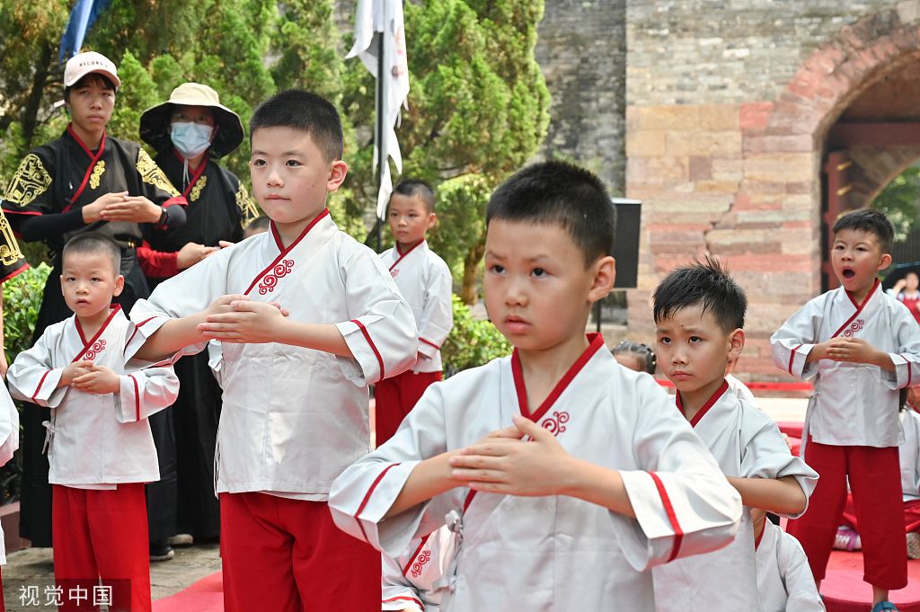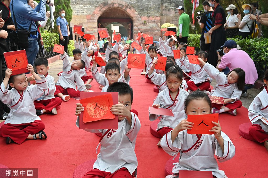 2022年7月31日,广东广州,学童学习礼敬先贤的仪式。当日,一场传统“开笔礼”在广州番禺莲花山莲花古城内举行。小学童身穿传统服装,通过正衣冠、朱砂启智、写“人”字、击鼓鸣志等仪式接受传统文化教育。 中新社记者 陈楚红 摄