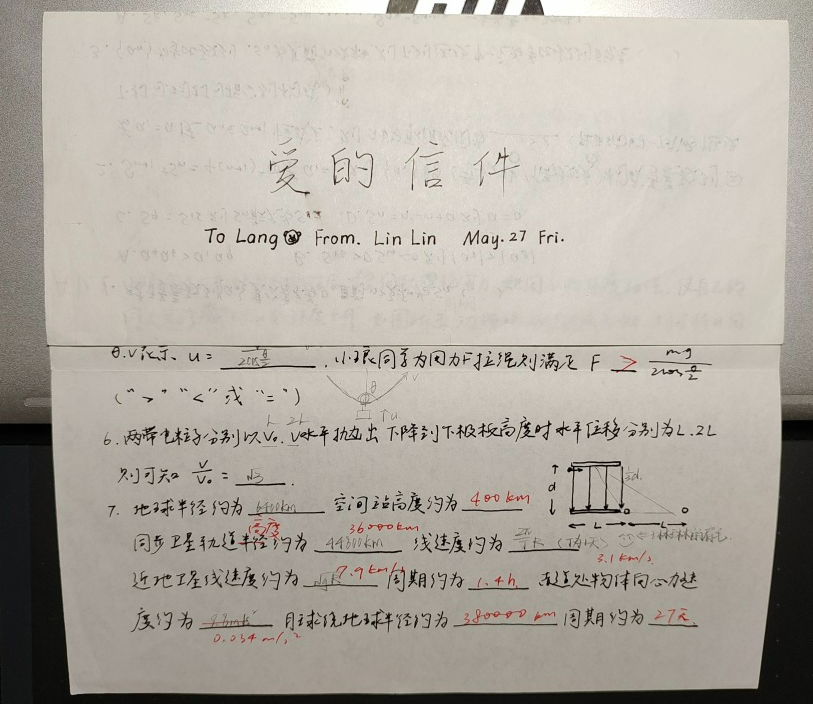 妹妹“琅”喜欢文科,初中开始她就整理了许多作文技巧并编辑成册,被姐姐称为《朱琅宝典》拿去学习。姐姐“琳”偏好理科,高考自主复习时,她挑选了一些重要且容易忽视的数学、物理知识点,出了一小套卷子叫《爱的信件》给妹妹做。“自己在整理资料的时候,本身就在享受学习的快乐,整合自己的知识,也可以帮助对方学习”,这样的姐姐妹妹,珞珞珈珈太羡慕了,爱了爱了!