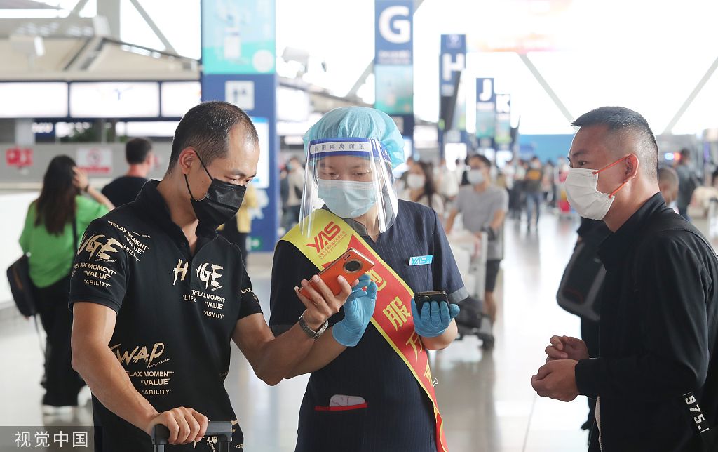 2022年7月31日,在昆明长水机场,候机大厅地服人员正在出港旅客提供服务。