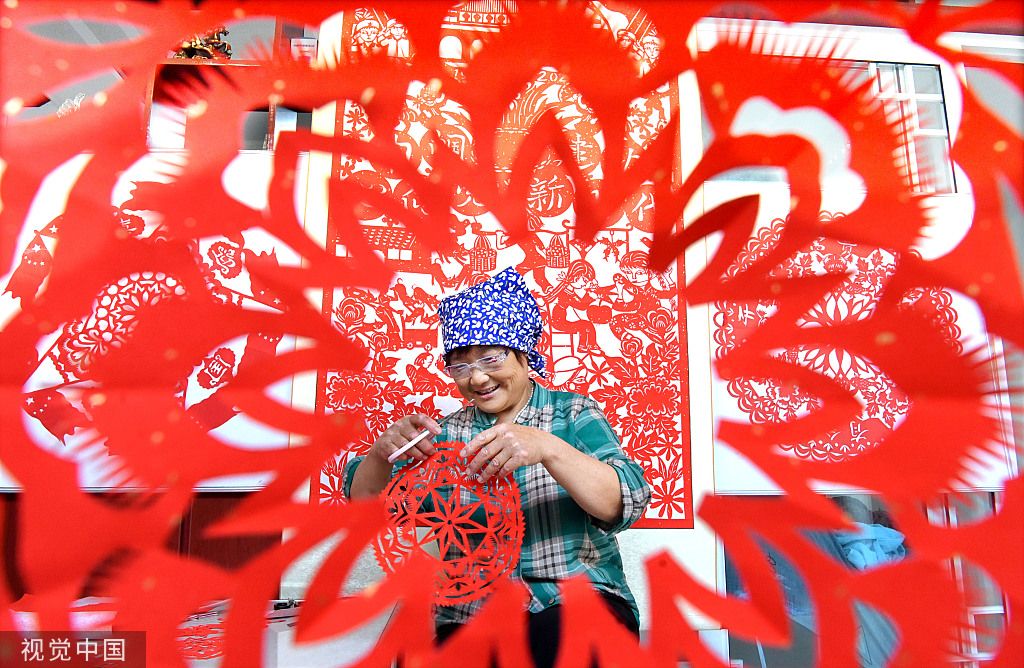 2022年8月1日,山东淄博,沂源县悦庄镇中营村,民间艺人在创作七夕剪纸作品。