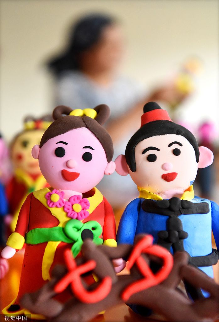2022年8月1日,山东淄博,沂源县悦庄镇西悦庄村,民间艺人在创作七夕泥塑作品。