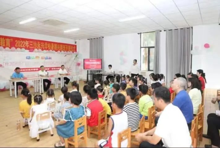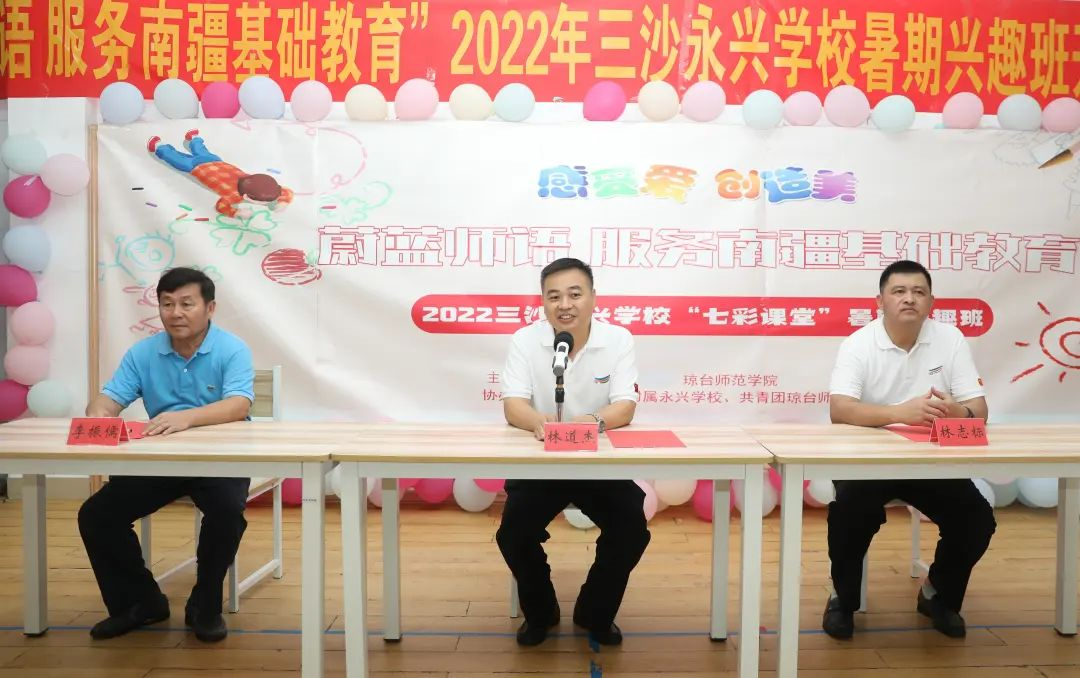 三沙市副市长林道杰、三沙市市委副秘书长林志标、三沙市社会工作局副局长李振儒、琼台师范学院带队老师及全体支教老师、学生及家长等80余人出席了本次暑假支教兴趣班的开班仪式。