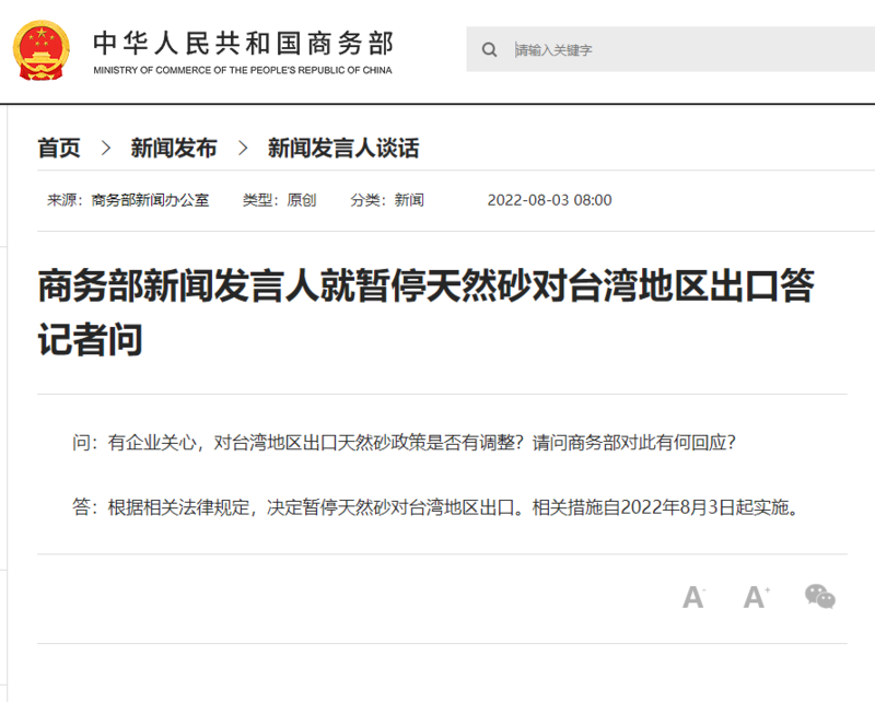 商务部新闻发言人就暂停天然砂对台湾地区出口答记者问。有企业关心,对台湾地区出口天然砂政策是否有调整?请问商务部对此有何回应?商务部新闻发言人表示,根据相关法律规定,决定暂停天然砂对台湾地区出口。相关措施自2022年8月3日起实施。