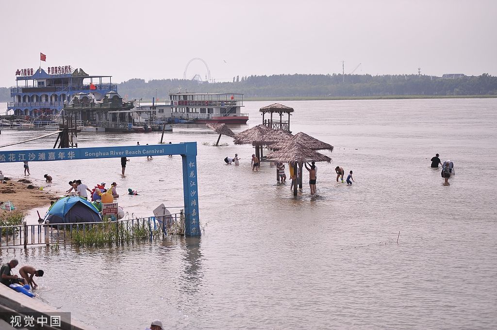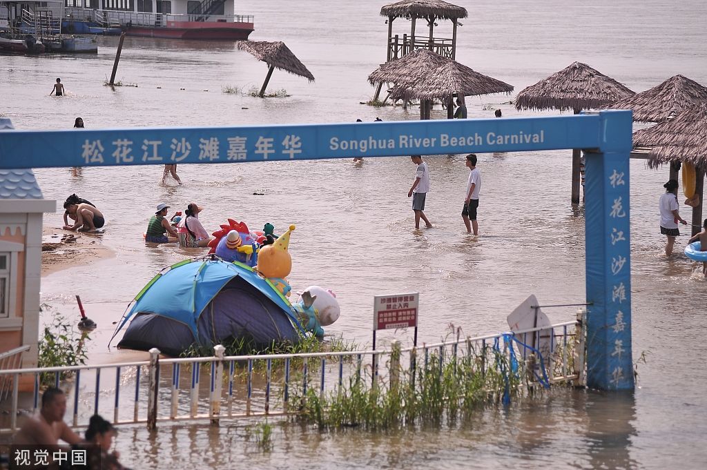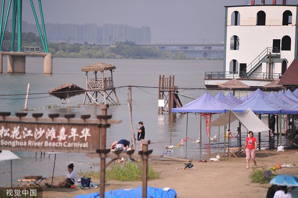 2022年8月2日,哈尔滨,松花江水位达到117.03米,距警戒水位1.27米。江边公益浴场上的沙滩和遮阳伞都淹在了水中。
