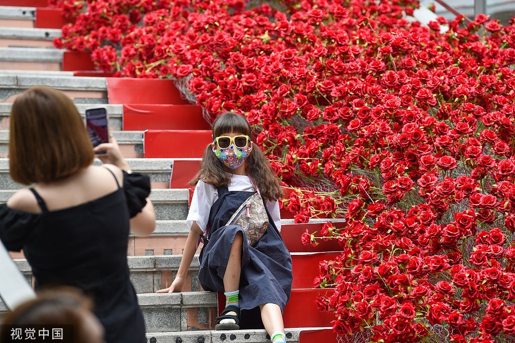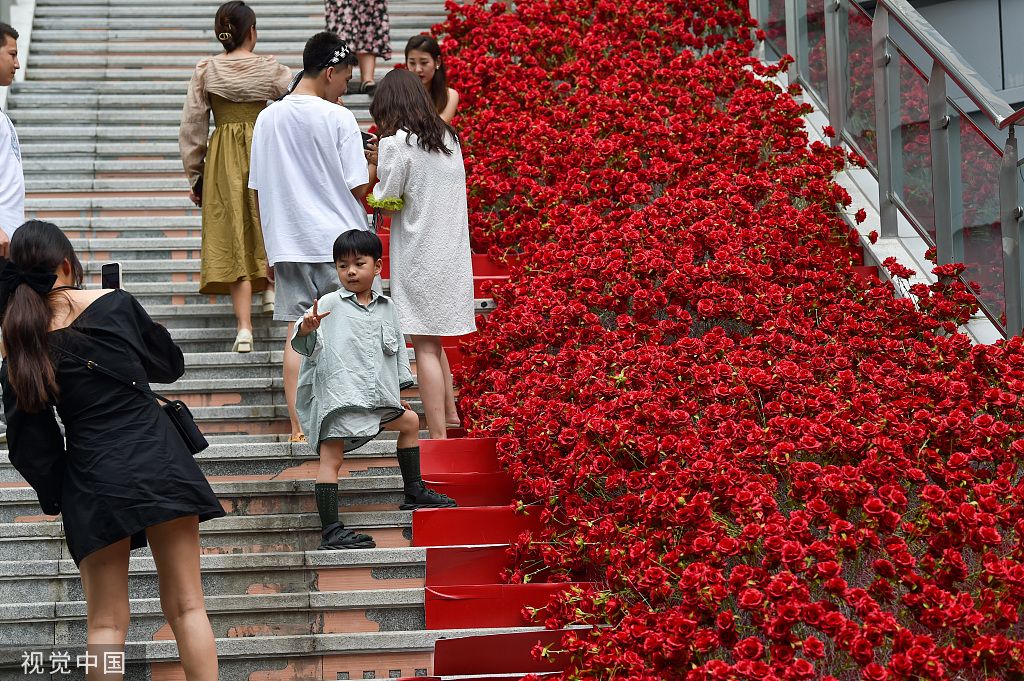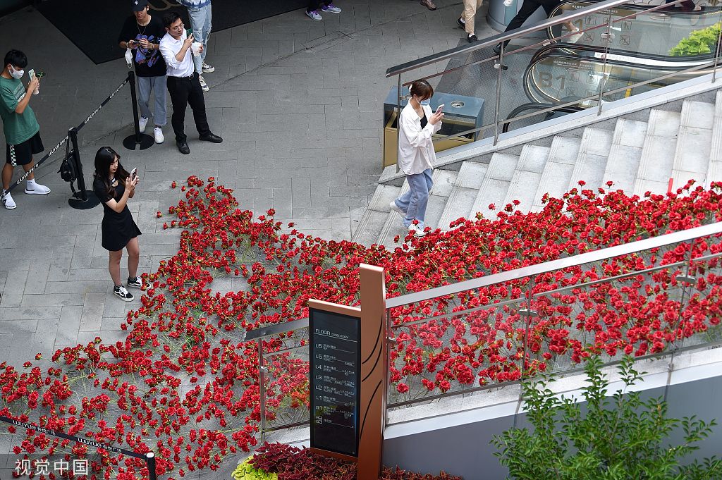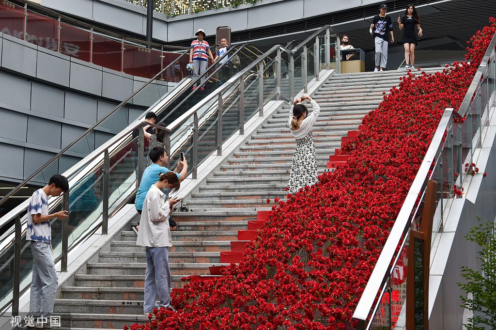 2022年8月3日,南京,七夕临近,一购物中心前长达20米的楼梯上铺满了玫瑰,吸引市民前来观赏、拍照。