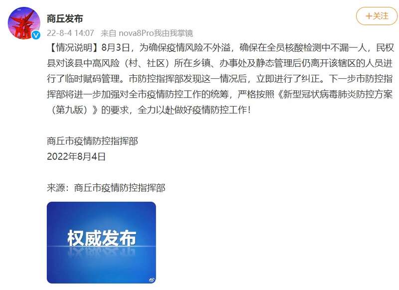 8月3日,为确保疫情风险不外溢,确保在全员核酸检测中不漏一人,民权县对该县中高风险(村、社区)所在乡镇、办事处及静态管理后仍离开该辖区的人员进行了临时赋码管理。市防控指挥部发现这一情况后,立即进行了纠正。下一步市防控指挥部将进一步加强对全市疫情防控工作的统筹,严格按照《新型冠状病毒肺炎防控方案(第九版)》的要求,全力以赴做好疫情防控工作!