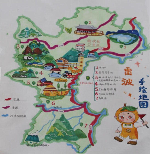 一幅兼具情怀与风格的手绘地图跃然纸上。团队以金沙江流域为主轮廓线,国道、省道为交通要径,绘制出雷波大体轮廓,以绿色为主色调,突出雷波县独有的山地地势以及等高线图。