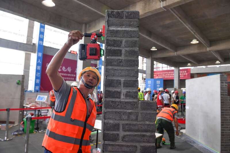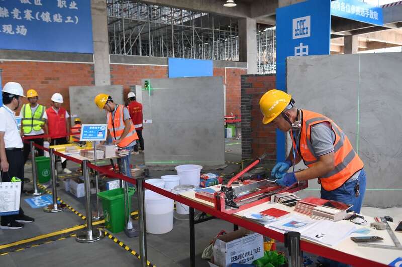 中国青年报客户端合肥8月6日电(通讯员 江竹月 中青报·中青网记者 王海涵)在一方工位里,选手聚精会神,在摆放的工具中熟练地挑选,先根据图纸切割瓷砖,再通过测量,砌筑不同颜色的瓷砖,每贴几块瓷砖,顾不上擦汗,要用尺子测量一下是否平整,外观是否精美,连每块砖背后加上的水泥量都有讲究……