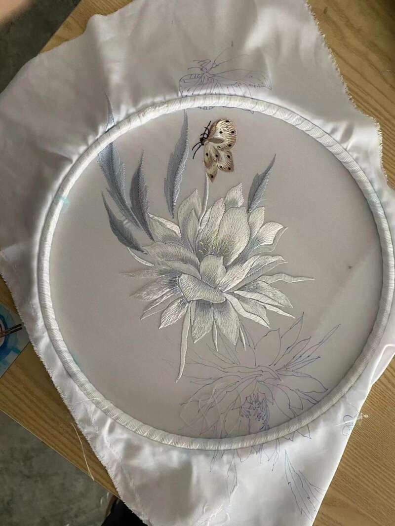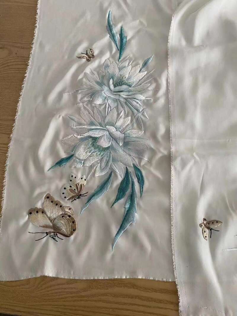 苏绣人工费很高,因为绣工需要劈丝,一根线劈成10根丝,工作量要翻10倍。劈丝越细意味着越多针,光泽越好,就像一只猫毛发细密而有光泽,远看就在发亮。《重逢<牡丹亭>》有很多花纹是传统苏州绣工无法接受的。我们的图案更多来自宋画,走写实风格,比如蝴蝶是黑色的,树叶可能有残缺。但在苏州制作时遇到困难,绣工们对我说,蝴蝶不能这样配色,树叶不能翻卷。