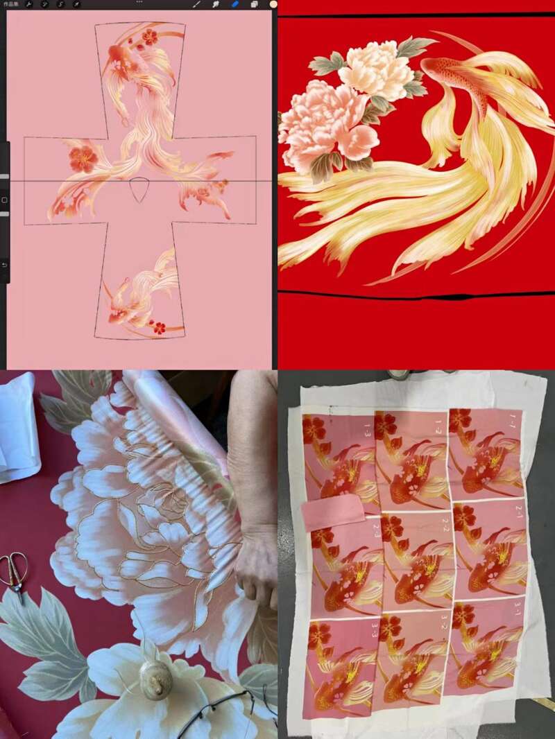 单雯戏服上有一条很大的鱼,我们用了电脑绘图,选最适合的颜色,然后做1 ∶ 1喷绘,定色之后,开始刺绣。喷绘在苏州打印了很多次,都不行,又在北京弄了三四次。
