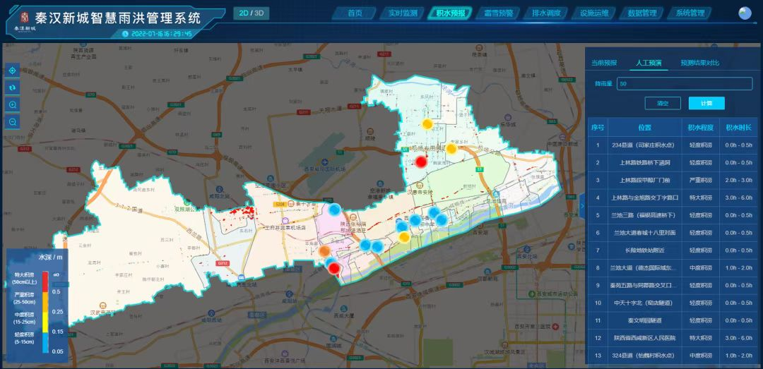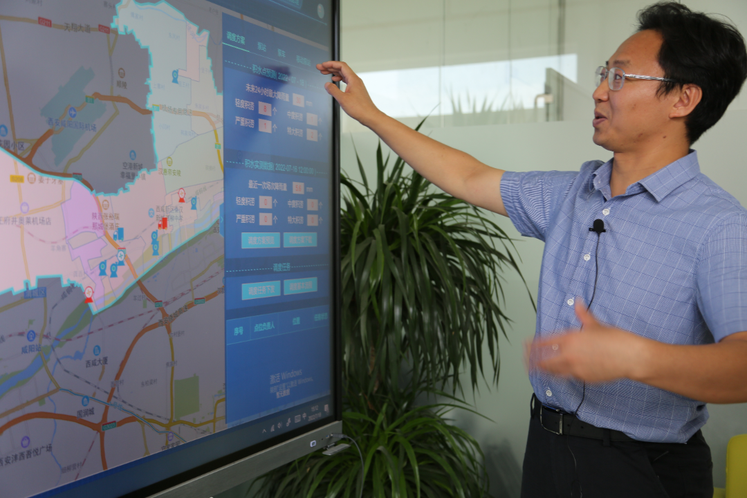 “我们是基于气象预报信息,通过我们的模拟平台,模拟预测出了秦汉新城在将来24小时内的大雨情况下,它的积涝的一个分布区位,这场雨可能导致特大积涝点两处,严重积涝点一处。”侯精明教授正在带领团队通过智慧雨洪管理系统分析秦汉新城积水预测。