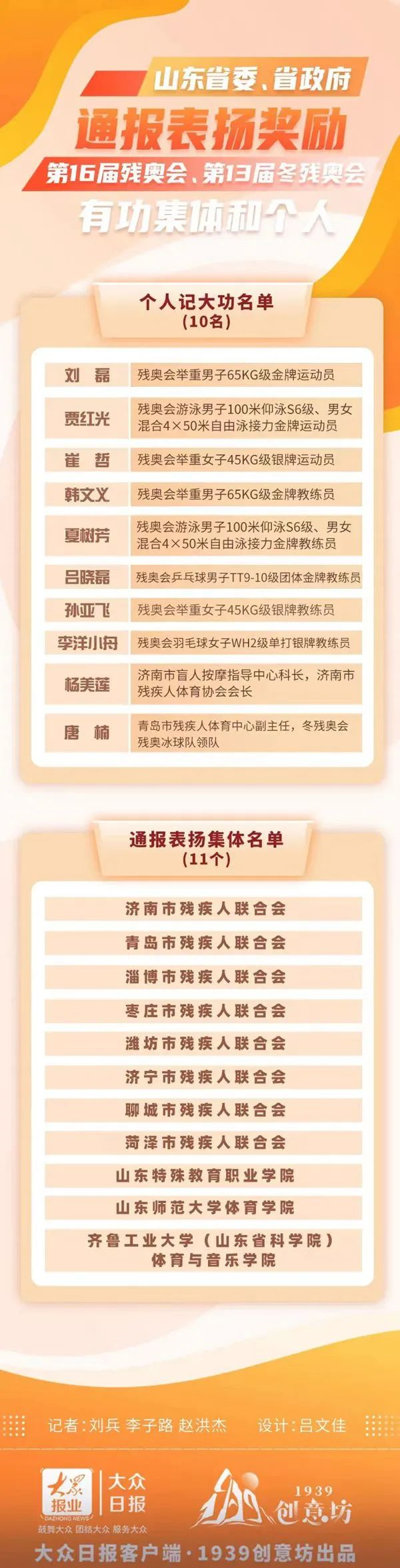 近日,山东省委、省政府印发《中共山东省委、山东省人民政府关于表扬奖励第16届残奥会、第13届冬残奥会有功集体和个人的通报》,山东师范大学体育学院入选通报表扬集体名单,体育学院2007级校友吕晓磊入选个人记大功名单。