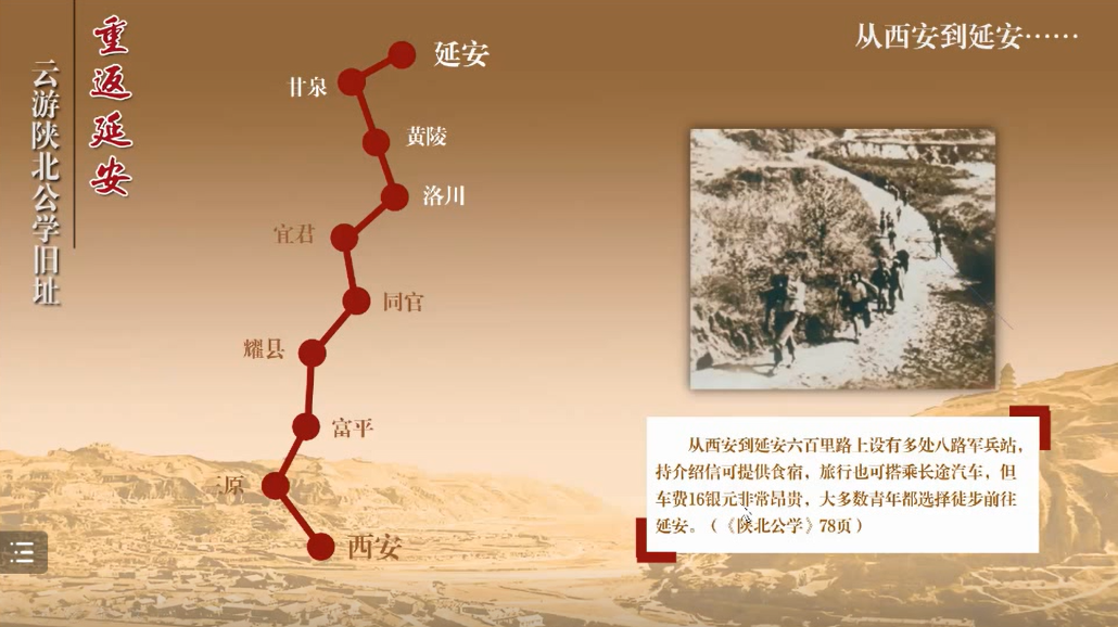 第一站 ,我们来到博物馆虚拟序厅,这里展示的是陕北公学从西安到延安的路程,那是一段20世纪30年代的革命青年们从西安奔向延安的路程,也是一段陕公青年们求学的三百公里“行军路”。借助VR技术,我们可以看到西安的八路军办事处。办事处包含有陕北公学招生办、临时宿舍等。随后,我们可以看到以动画与图片相结合的形式呈现的从西安到延安的路线,包括途经的“洛川会议”的召开地点洛川,校歌中所唱“这儿是我们祖先发源之地”的黄陵。