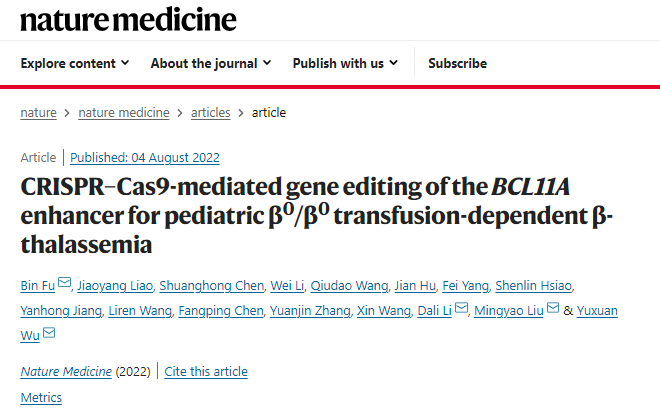 中南大学湘雅医院血液科副主任医师付斌与上海邦耀生物科技有限公司刘明耀、吴宇轩团队合作开展的临床研究结果“CRISPR/Cas9介导的BCL11A增强子基因编辑治疗儿童β0/β0输注依赖性β-地中海贫血”,在Nature Medicine(Q1,IF 87.241)以论著形式在线发表,其题为“CRISPR/Cas9-mediated Gene Editing of the BCL11A Enhancer for Pediatric β0/β0 Transfusion-Dependent β-Thalassemia”。付斌为论文共同第一作者和共同通讯作者,湘雅医院为论文共同通讯及共同第一单位。