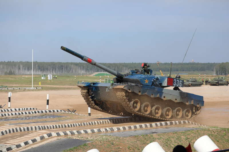 8月14日,“国际军事比赛-2022”坦克两项单车赛中,中国车组驾驶坦克通过障碍。于子恒/摄