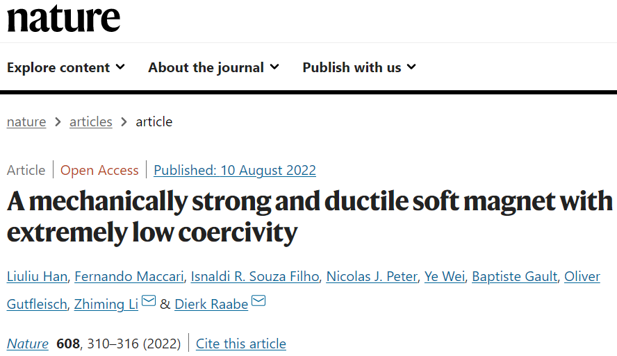 近日,中南大学材料科学与工程学院李志明教授与德国马普所Dierk Raabe教授等研究人员合作在国际学术期刊Nature上发表了题为“A mechanically strong and ductile soft magnet with extremely low coercivity”的研究论文,论文报道了一种具有高机械强度、高拉伸延展性、低矫顽力、中等饱和磁化强度和高电阻率的多组元软磁合金,为解决金属材料机械性能与软磁性能之间的矛盾提供了重要思路。该论文的第一作者为中南大学公派马普所留学博士生韩六六,中南大学李志明教授和马普所Dierk Raabe教授为通讯作者。