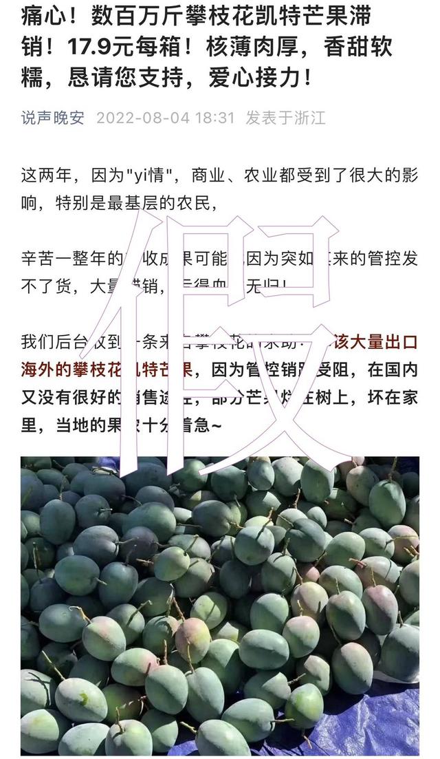 据封面新闻报道,最近某微信公众号发布的四川攀枝花凯特芒果“大量滞销”、农民“亏得血本无归”等消息,与真实情况并不符合。从攀枝花市市场监管局行政执法监督科的回应来看,这纯属“卖惨营销”,也有网民称之为“悲情营销”。而且,这绝非个案,媒体在报道中也指出,攀枝花芒果、凉山会理石榴、凉山盐源县苹果等都有过类似被“卖惨营销”的情况。