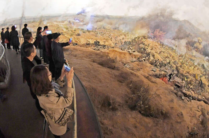 ↑辽沈战役纪念馆讲解员为观众介绍人民解放军攻城部队攻破锦州城垣复原景象(2021年2月2日摄)。