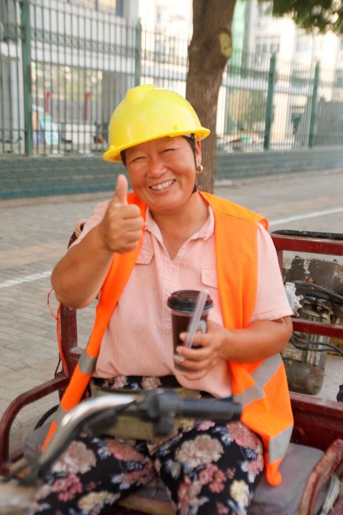 图为户外工作者收到绿豆汤后,为志愿者点赞。郭金山/摄。