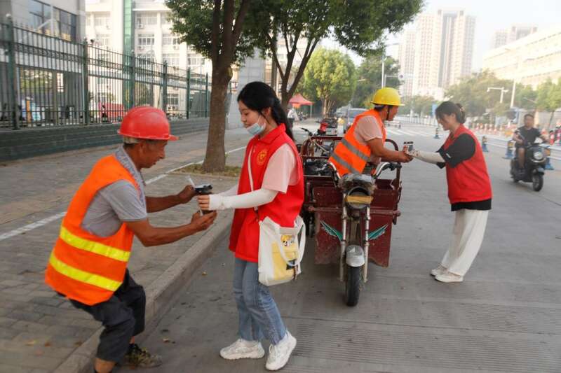 中国青年报客户端讯(通讯员 郭金山 中青报·中青网记者 王海涵)近日,安徽省阜阳市临泉县城港口路与新建路交口处,党员青年志愿者李晓萍把一杯插有吸管的绿豆汤双手递给一位女环卫工。女环卫工感激地说:“志愿者把一杯杯暖心的绿豆汤送到我们手里,感谢有你们在背后默默地关心和支持。”