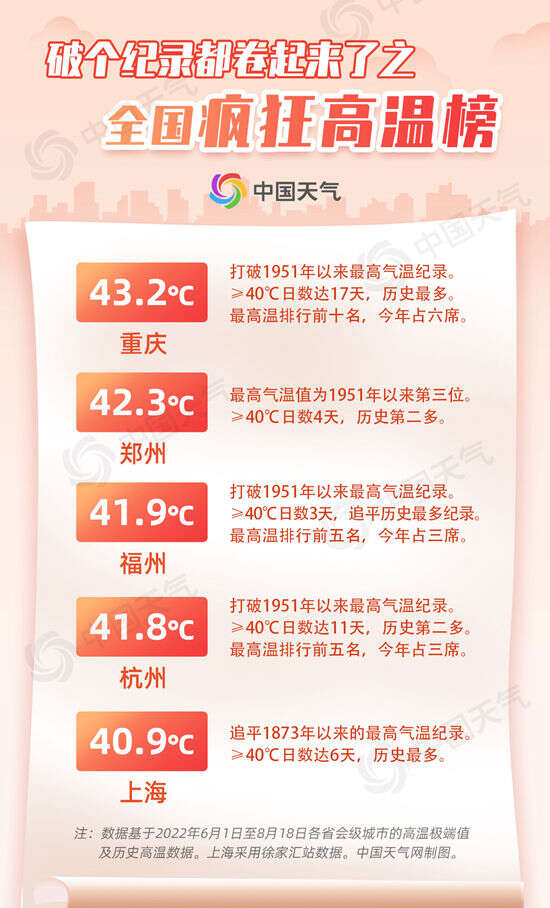 此外,福州、杭州的日最高气温也打破了1951年以来的最高纪录,上海徐家汇则是追平了百余年的气温最高纪录。