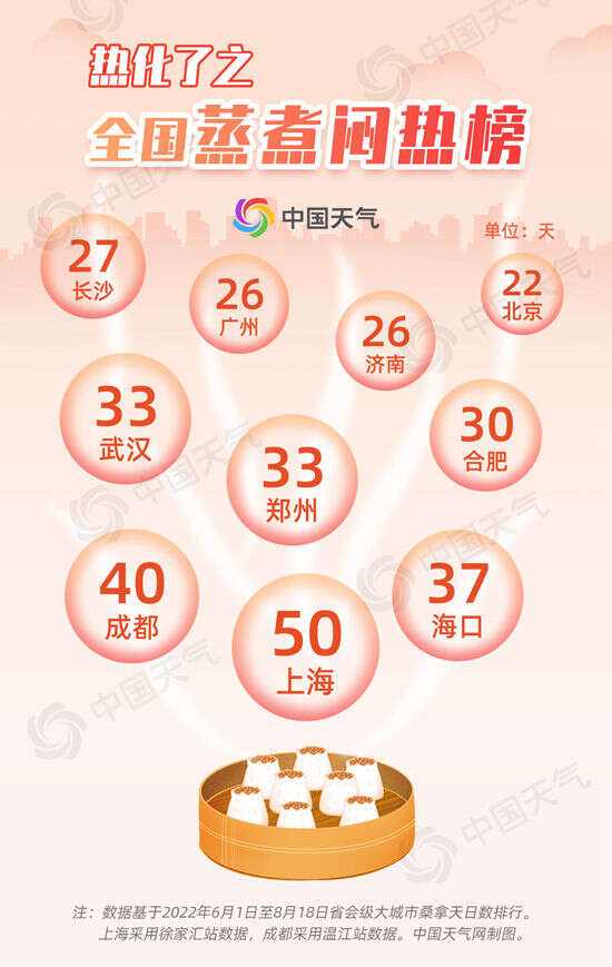 今年的高温强度强、波及范围大,不仅是南方高温炙烤,北方不少地区也体验了常年少有的持续桑拿天。根据今年6月以来的桑拿天日数统计,上海、成都、海口、郑州、武汉、合肥、长沙、广州、济南、北京成为今夏“十大桑拿城”。