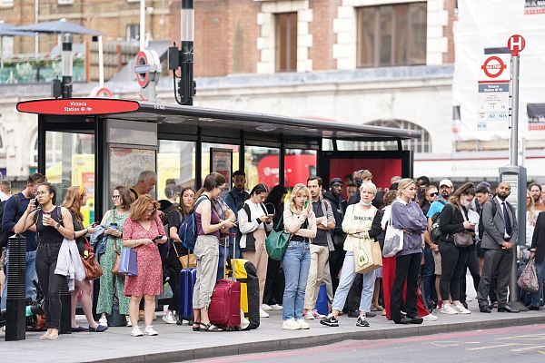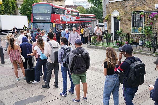当地时间2022年8月19日,英国伦敦,由于罢工,维多利亚地铁站关闭,通勤者在地铁站外排队等候公共汽车。铁路、海运、运输工会(RMT)代表的地铁工人们因养老金纠纷进行了为期一天的罢工。与此同时,公共汽车司机工会开始了为期两天的罢工,原因是另一场工资纠纷。