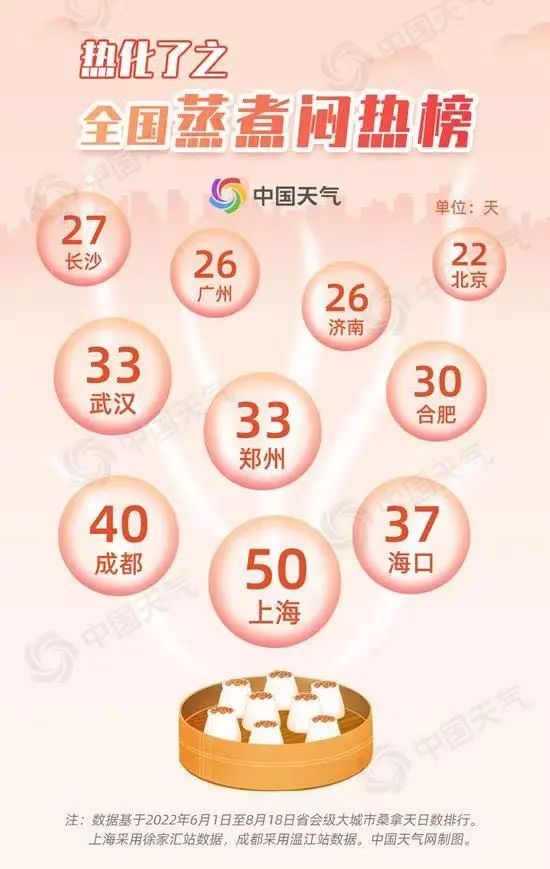 今年的高温强度强、波及范围大,不仅是南方高温炙烤,北方不少地区也体验了常年少有的持续桑拿天。根据今年6月以来的桑拿天日数统计,上海、成都、海口、郑州、武汉、合肥、长沙、广州、济南、北京成为今夏“十大桑拿城”。