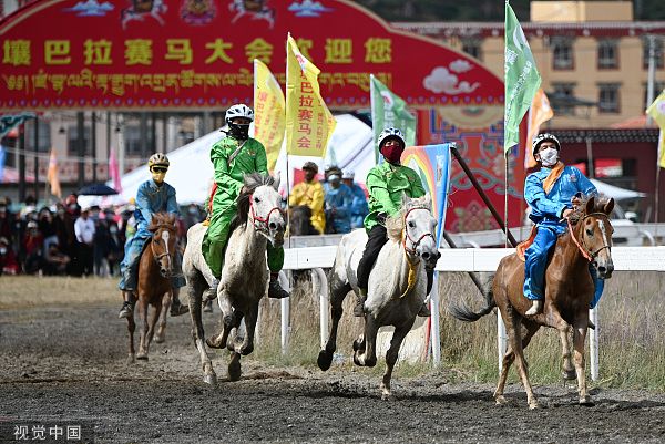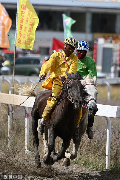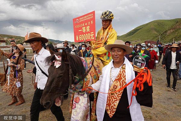 2022年8月19日,四川阿坝,2022年“壤巴拉文旅”活动赛马会一万米耐力决赛在壤塘县南木达镇举行。
