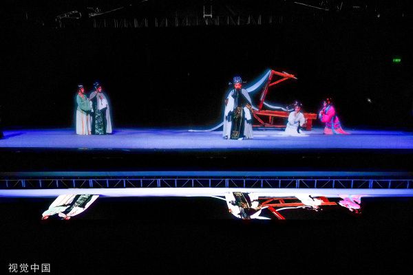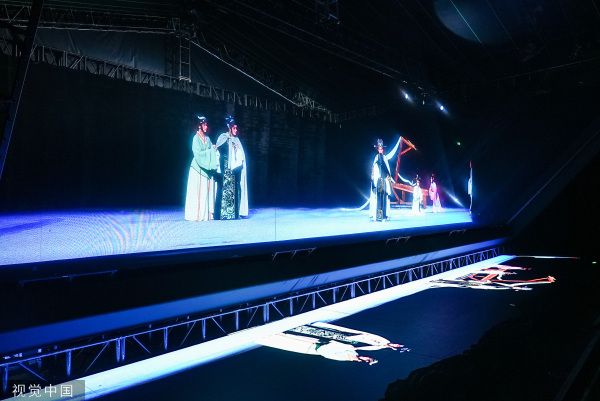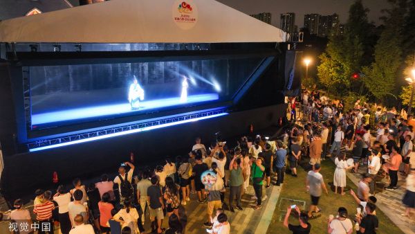 2022年8月20日,江苏昆山,大鱼湾草坪广场利用5G+3D全息投影技术,将当晚在昆山文化艺术中心主舞台上演的《浣纱记》进行同步投影,实线戏曲的“穿越演绎”。本次昆剧《浣纱记》的演绎,将开启戏曲与科技结合的新方式,让广大市民身临其境地观赏《浣纱记》。观众以裸眼观看昆剧立体成像,让传统艺术从剧场中“走出来”,实现传统艺术的“沉浸式观演”、“超时空”接触,迸发戏曲艺术的新活力。