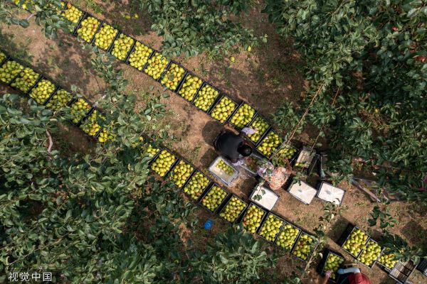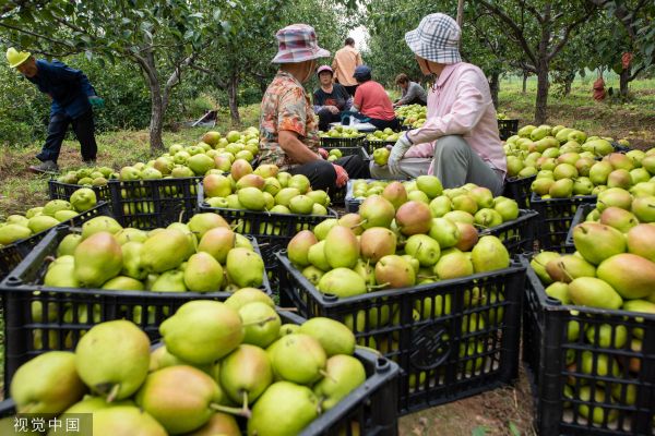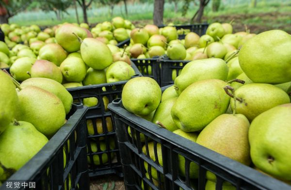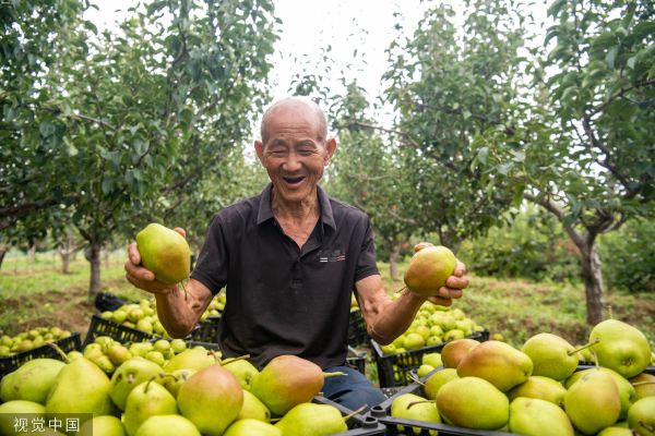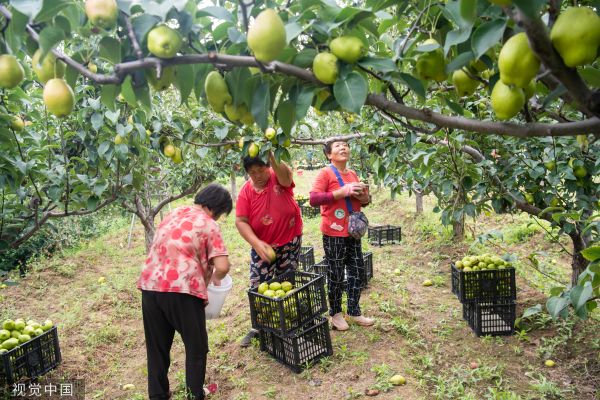 2022年8月20日,山西运城,村民采摘丰收的金梨。