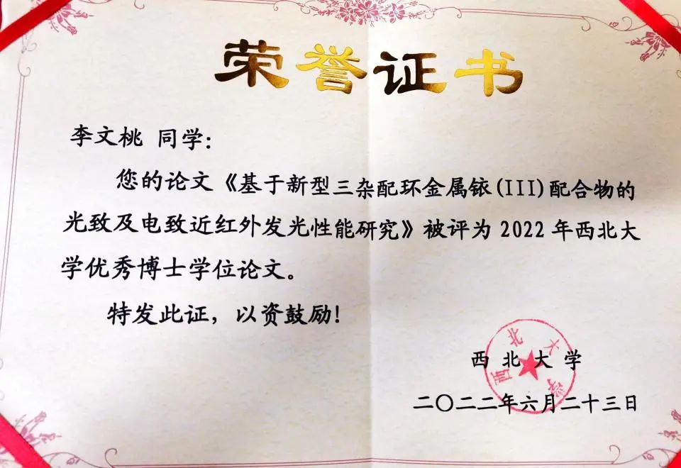 在西北大学,李文桃找到了“兴之所在”——过渡金属配合物的合成与光电性能研究。她不断地阅读文献、做实验,和课题组协同合作,在这个有爱有科学的大家庭中,有导师的指导、课题组的配合加之自身的努力,李文桃的12篇SCI论文(含共同一作及通讯作者)诞生了。