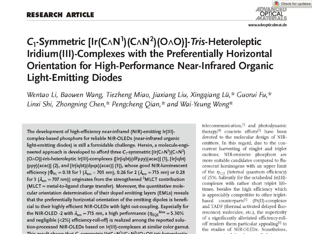 在导师的推荐下,李文桃相继加入到2项国家自然科学基金面上项目(“可见-红外多模式光调节与光转换金属-有机材料的设计与性能研究”和“近红外特征发光的导电性混金属聚合物薄膜材料的制备研究与应用”)和1项国家专利项目(稀土-铱-混金属配合物类软盐的制备方法)中。国家强化自然科学基金对高校的支持力度,为项目的成功提供了资金保障和物质扶持,团队成员奋斗起来更加充满动力。在这些项目中,以吕兴强教授为主导的团队成员表现出了对科研事业尽心尽力的态度和对后辈耐心负责的教导,让李文桃深受感动,更加认真地对待每一项工作,为项目的成功也付出了巨大努力。