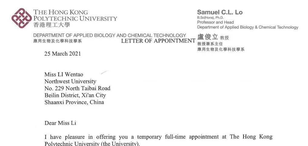 博士研究生的最后一年,导师向李文桃介绍了香港理工大学的交流计划。李文桃对此十分感兴趣,在导师的帮助下,她认真完成了英文简历和研究计划的撰写,向香港理工大学提交申请。最终,李文桃加入了仰慕已久的香港理工大学黄维扬教授的课题组,目前仍在香港进行科学研究。