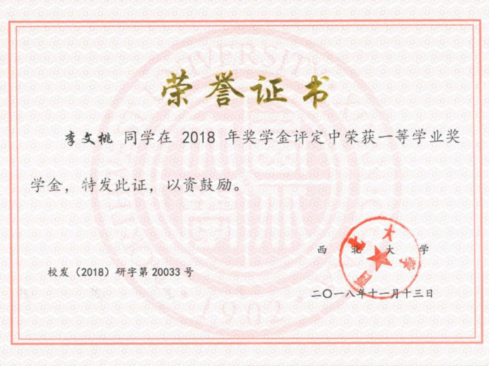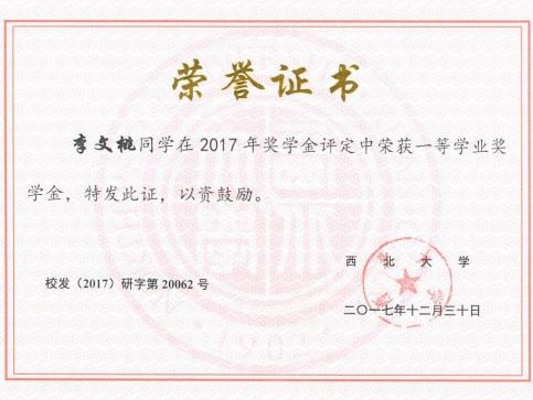 时光不负有心人,2017年,李文桃以应用化学专业第一的成绩进入西北大学化工学院,师从吕兴强教授,攻读学术型硕士,研究方向是铱(III)金属配合物有机近红外发光材料。在西大,李文桃更加严格要求自己,不断充实理论知识体系,积极参与科研实验项目,做到理论与实践并重。李文桃的优异成绩除了自身的努力,也离不开导师和学院的栽培,实验室良好的氛围更是给了她不断奋斗的动力。