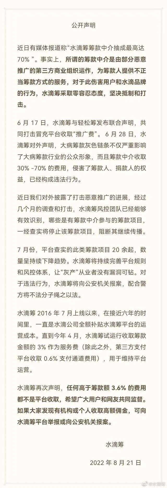 水滴筹发布的声明称,近日有媒体报道称“水滴筹筹款中介抽成最高达70%”,事实上,所谓的筹款中介是由部分恶意推广的第三方商业组织运作,为筹款人提供不正当筹款方式的服务。