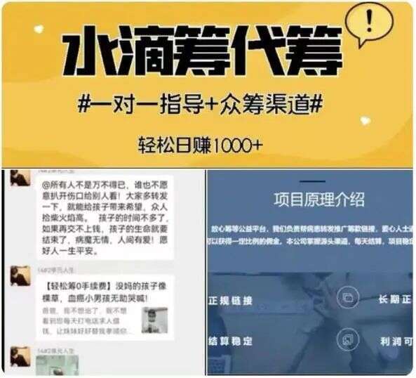 上周,针对“灰产”问题,水滴筹首次披露了打击恶意推广的相关数据:目前已累计管控恶意推广案例800余起,管控恶意推广的用户账号600多个。惊人的是筹款中介从中抽成比例高达30%-70%。
