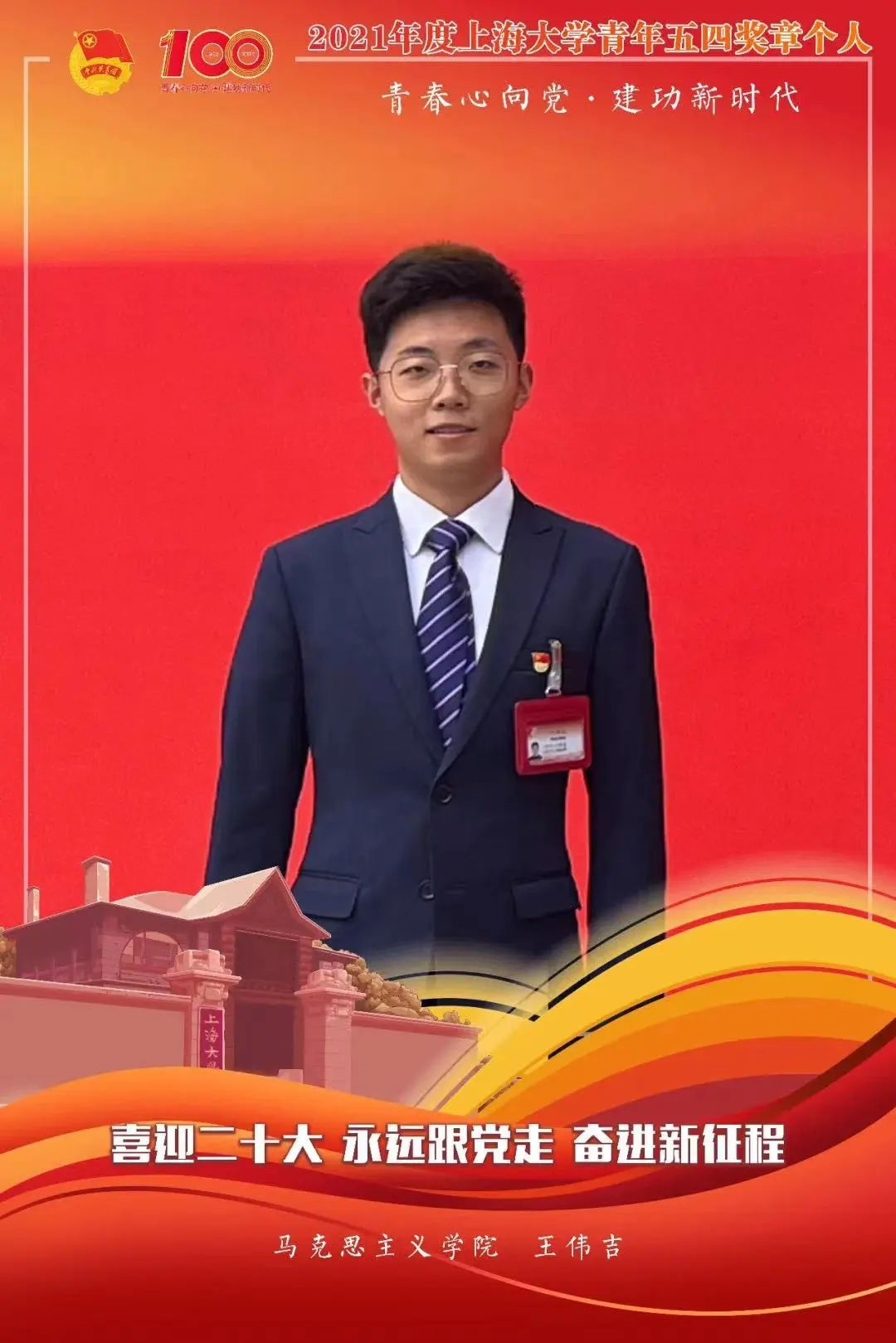 王伟吉,马克思主义学院思想政治教育专业2019级本科生,中共党员,现为共青团上海市委“青春上海”新媒体平台实习生,上海市虹口区北外滩街道居民区团支部委员、副书记(挂职),上海大学马克思主义学院本科生党支部组织委员。