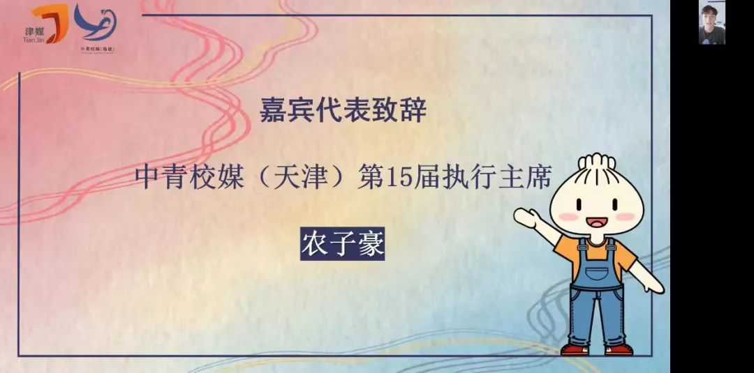 活动伊始,中青校媒(天津)第15届执行主席农子豪作为嘉宾代表致辞,对各位嘉宾、成员和观众的到来表示欢迎与感谢,并指出本次交流会的意义不仅在于促进区域文化交流、推动新媒体思维碰撞,更是为了将校媒精神以接力和见证的形式传承下去,是为了将相对分离的区域校媒凝聚起来,共同商讨校媒的未来进路,探索区域校媒的创新型合作。