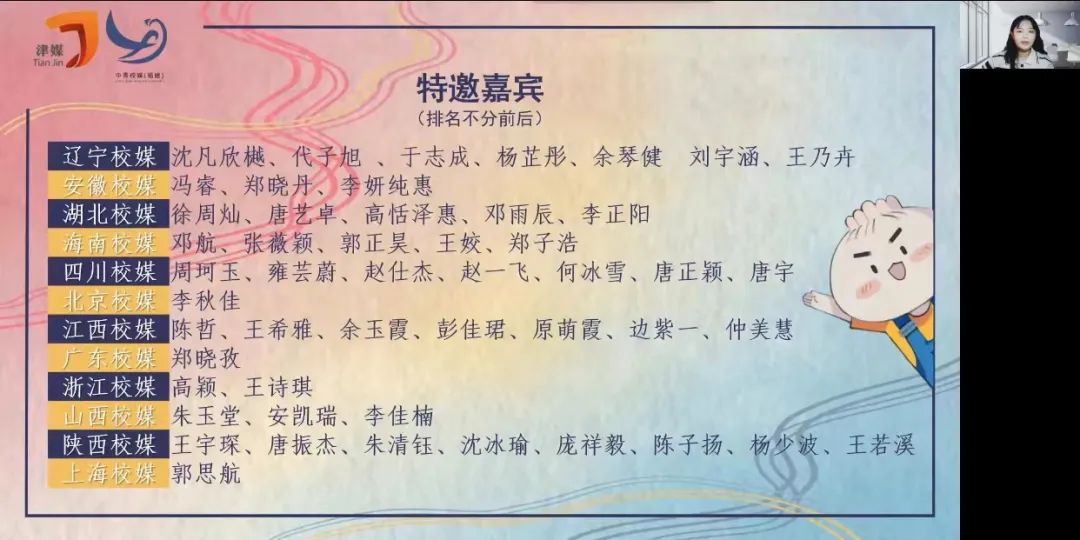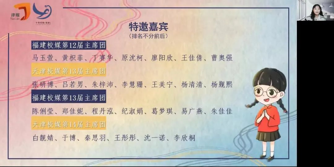 本次活动特别邀请中青校媒秘书处、中国青年报记者罗希老师和毕若旭老师,北京、上海、陕西、山西、辽宁、安徽、湖北、浙江、江西、广东、四川、海南十二个区域校媒的主席团成员以及天津、福建校媒的往届主席团成员作为嘉宾出席。由天津校媒第15届主席团和福建校媒第14届主席团担任评审嘉宾,跨区域联动的形式将不同的校媒情结交汇,大家在本次活动中共同见证“津”“闽”碰撞,倾听不一样的青年之声。