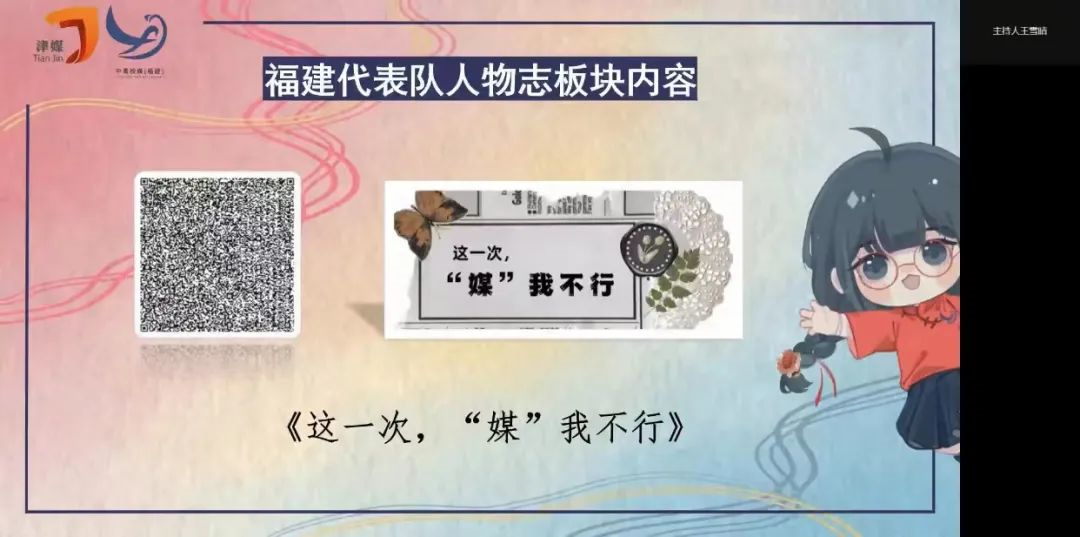 福建代表队则在“创意”“特色”“人物志”三个板块分别展示了对应的原创作品《当时针回转到那次选择前》《胡里福涂糊建话》《这一次,“媒”我不行》。