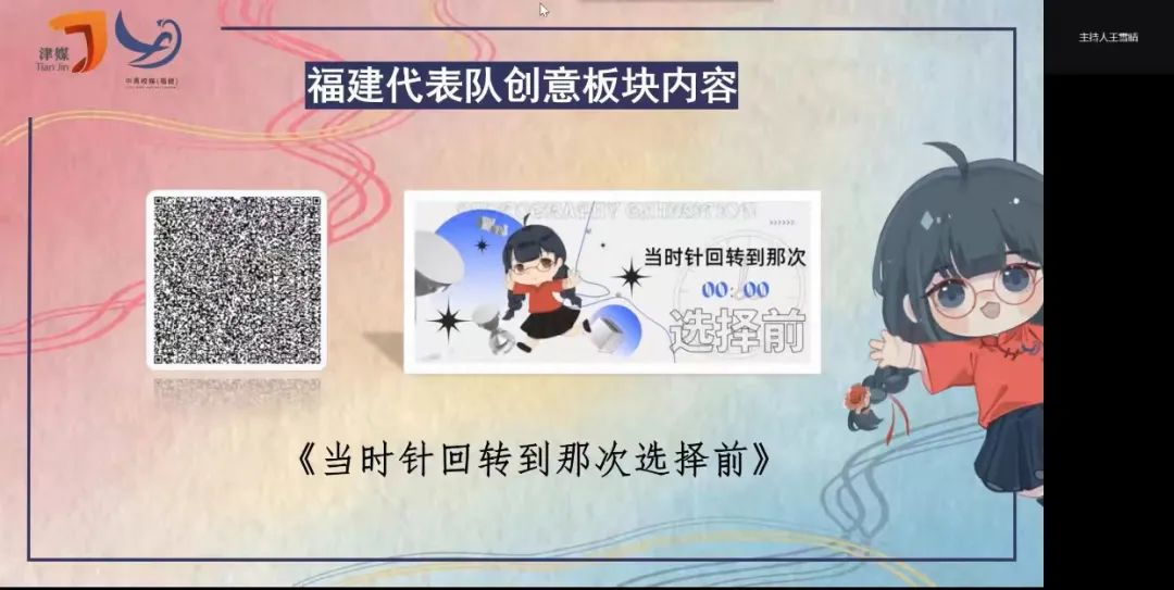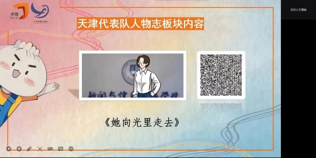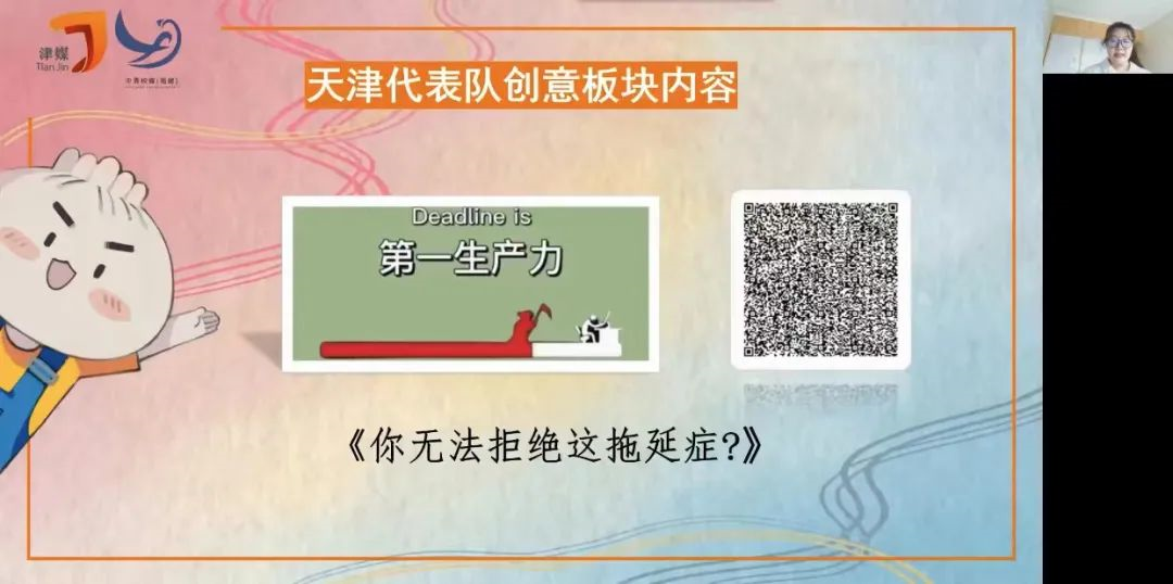 在作品展示环节,天津代表队在“创意”“特色”“人物志”三个板块分别展示了对应的原创作品《你无法拒绝这拖延症?》《小津梦回记事》《她向光里走去》。