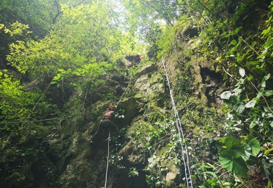 两名经过专业培训的消防救援人员携带装备,深入天坑进行搜救——