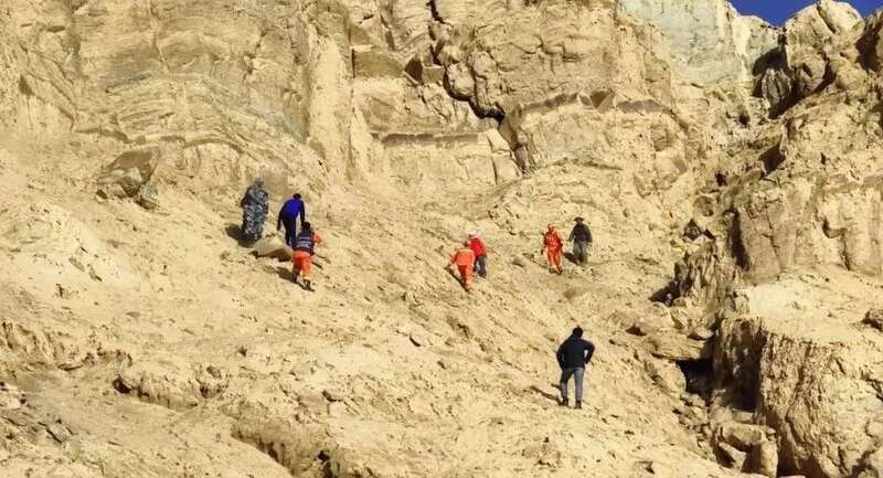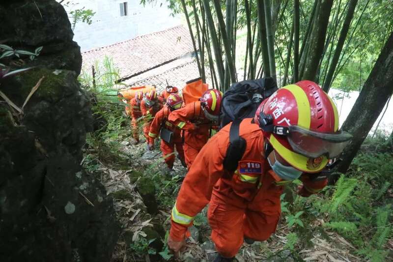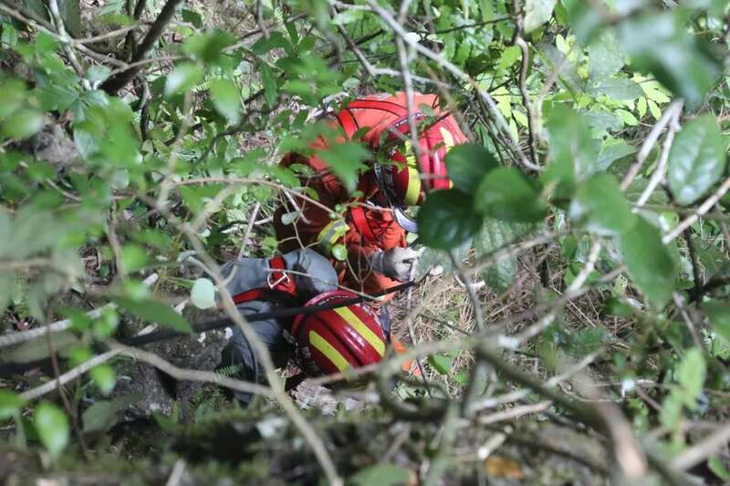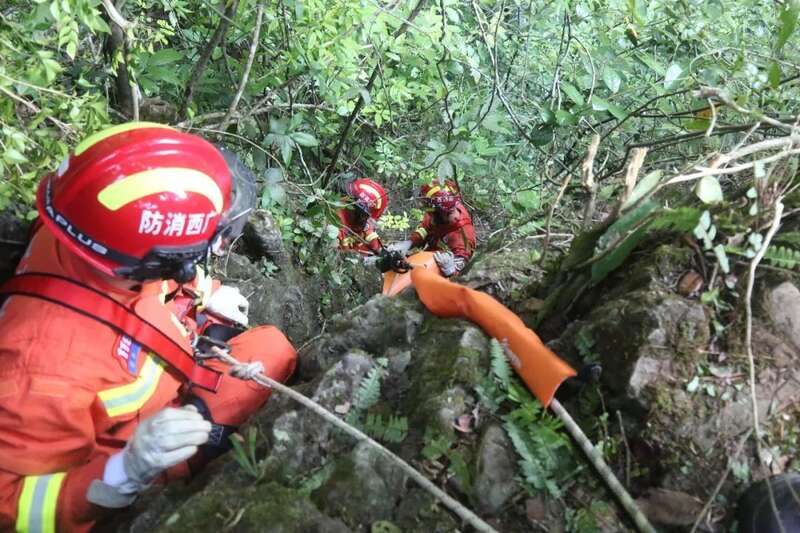 消防救援人员火速前往,到达被困点山下后,徒步登山约300米,来到天坑口。